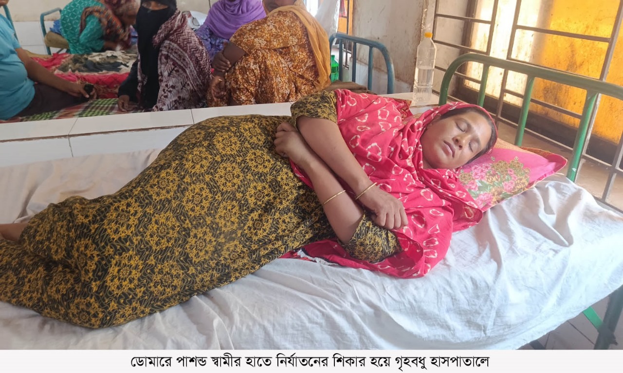 ঘটনাটি ঘটেছে উপজেলা বোড়াগাড়ী ইউনিয়নের পশ্চিম বোড়াগাড়ী দোলাপাড়া স্কুল সংলগ্ন গ্রামে। থানার অভিযোগ সুত্রে জানাযায়, উক্ত গ্রামের আব্দুল কুদ্দুসের ছেলে শাহিন ইসলামের সাথে একই ইউনিয়নের পশ্চিম বোড়াগাড়ী বটতলী (বুড়ারডোবা) এলাকার মৃত- আব্দুস ছাত্তারের কন্যা স্বপ্না আক্তারের বিগত ১৮ বছর পূর্বে বিয়ে হয়। সংসার জীবনে তাহাদের ৩টি সস্তান রয়েছে। গৃহবধু স্বপ্নার স্বামী, শাশুরী এবং ননদ মিলে প্রায় সময় স্বপ্নাকে কারণে অকারণে শারীরিক ও মানুষিক নির্যাতন করে। ৩টি সন্তানের কথা চিন্তা করে স্বপ্না সব নির্যাতন সয্য করে সংসার করে আসছে। এরই ধারাবাহিকতায় পারিবারিক বিষয়ে তুচ্ছ ঘটনাকে কেন্দ্র করে ঘটনার দিন গত সোমবার (২৫আগস্ট) সকাল ১১টায় সংসারের কাজ কর্ম নিয়ে শাশুরীর সাথে ঝগড়া হয়। এ সময় স্বপ্নার স্বামী শাহিন বাড়ীতে আসলে শাশুরী ও ননদের কুপরামর্শে পাশন্ড স্বামী বাশেঁর লাঠি নিয়ে স্বপ্নার কোমড়ে পিঠে ও পায়ে মধ্যযুগিয় কায়দায় বেধরক মারপিট করে। স্বামীর অমানুষিক নির্যাতনে স্বপ্না গুরুত্বর অসুস্থ হয়ে পড়ে। দিনরাত পেরিয়ে পরদিন প্রতিবেশীরা স্বপ্নার বাবার বাড়ীতে সংবাদ দিলে তার ভাই ও মা স্বপ্নাকে উদ্ধার করে ডোমার উপজেলা স্বাস্থ্য কমপ্লেক্সে ভর্তি করে। গত ৩দিন যাবত স্বপ্না হাসপাতালের বিছানায় অতি কষ্টে কান্নায় ভেঙে পড়ছে। এ বিষয়ে স্বপ্নার ভাই সোহাগ ৩জনের বিরুদ্ধে ডোমার থানায় অভিযোগ দায়ের করেন। ডোমার থানার অফিসার ইনচার্জ আরিফুল ইসলাম জানান, তদন্ত করে দোষী ব্যক্তিদের বিরুদ্ধে আইনগত ব্যবস্থা নেয়া হবে। শাহিন মারধরের বিষয়টি শিকার করে জানান মাকে গালাগালির কারণে মাথা ঠিক ছিল না তাই এমনটি হয়েছে। জামাই সহ অপরাধীদের দৃষ্টান্তমূলক শাস্তির জোর দাবী জানান নির্যাতনের শিকার স্বপ্নার মাতা লুৎফা বেগম।