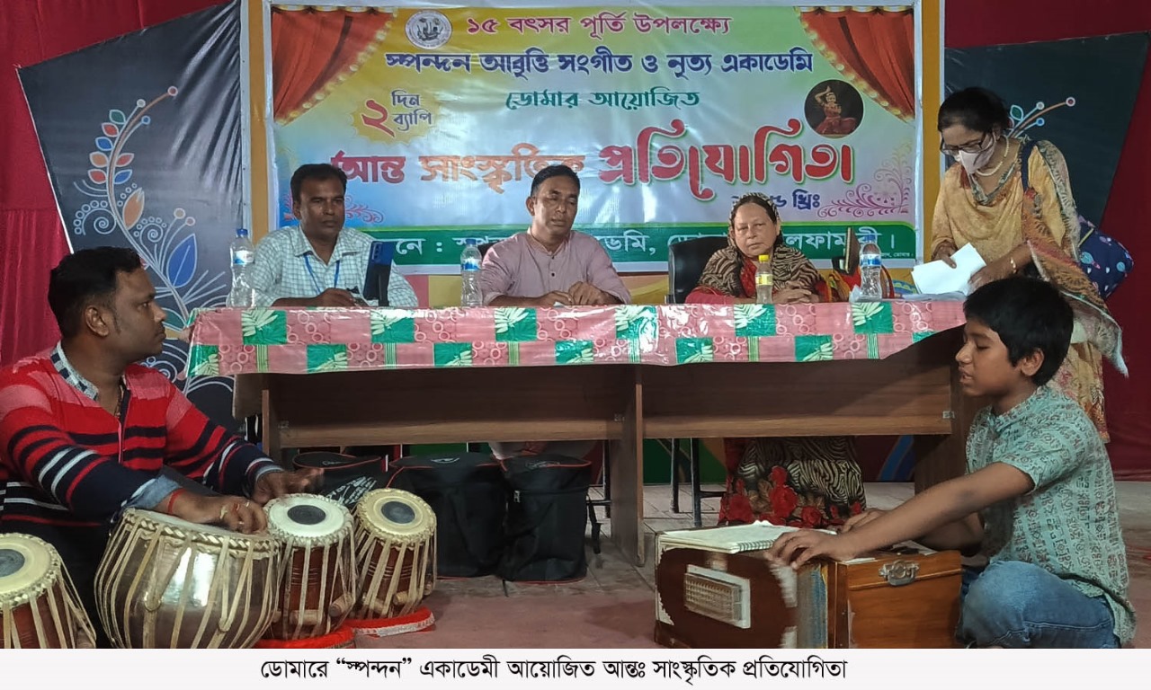 উৎসাহ ও উদ্দিপনার মধ্য দিয়ে নীলফামারীর ডোমারে ঐতিহ্যবাহী সাংস্কৃতিক সংগঠন “স্পন্দন” আবৃতি ও নৃত্য একাডেমী’র ১৫ তম প্রতিষ্ঠা বার্ষিকী উদযাপন উপলক্ষে ২দিন ব্যাপী আন্তঃ সাংস্কৃতিক প্রতিযোগিতা সুস্ট ভাবে সম্পন্ন হয়েছে।