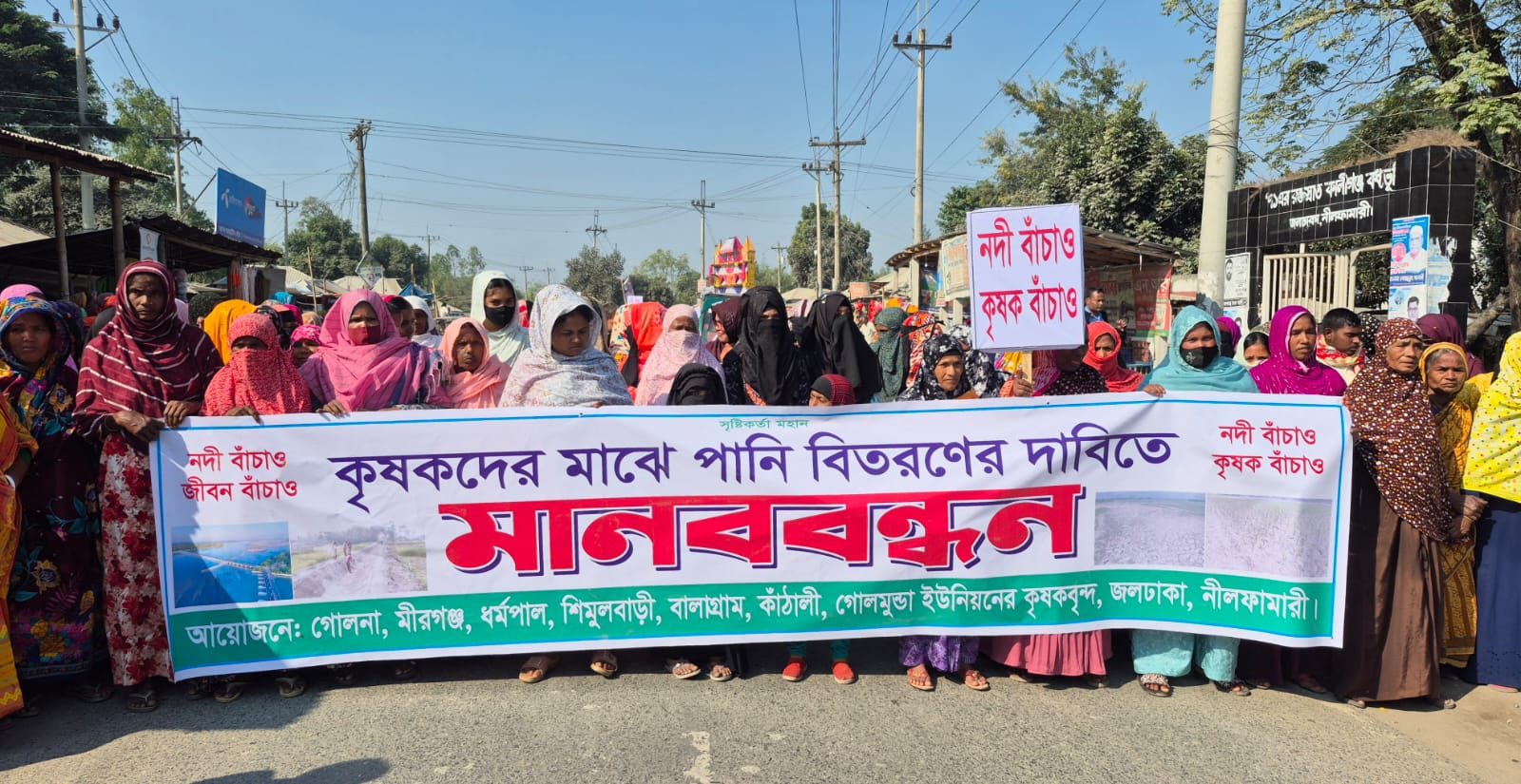 নীলফামারীর জলঢাকায় বুড়ি তিস্তা নদী খনন করে সেচ সুবিধা নিশ্চিতের দাবিতে মানববন্ধন ও সড়ক অবরোধ কর্মসূচি পালন করেছেন স্থানীয় কৃষকেরা। সোমবার (৮ ডিসেম্বর) দুপুরে জলঢাকা–ডিমলা সড়কের কালিগঞ্জ বাজার এলাকায় ঘন্টাব্যাপী মানববন্ধন শেষে তারা সড়ক অবরোধে অংশ নেন। এতে প্রায় তিন ঘন্টা ওই সড়কে যান চলাচল বন্ধ থাকে। এতে বক্তব্য দেন শফিক হোসেন, জামাল, আরশাদ ইসলাম, দুলাল হোসেন, জয়নাল আলী, ফরিদ খান, সাব্বির হোসেন সহ আরও অনেকে।